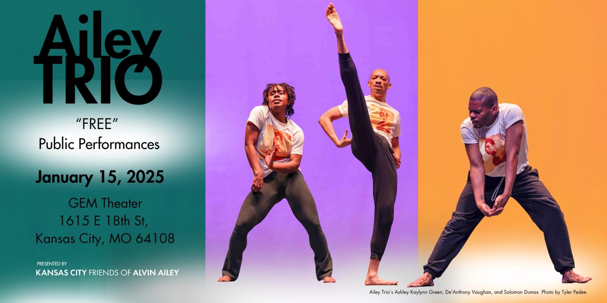 Ailey Trio is an engaging 60-minute presentation with three dancers from the internationally acclaimed Alvin Ailey American Dance Theater performing brief excerpts from its current repertory. The presentation is an exciting blend of lecture, class, and informal performance, designed to provide a comprehensive dance experience that focuses on how an Ailey dancer develops the skills needed for success including the importance of exercise, hard work, and artistic expression. The participants leave with a better understanding of what it takes to become a professional in any field. Ailey Trio, established in 1993, is unique to Kansas City and an important part of KCFAA’s arts education programming. Taking a short break from their rigorous schedule with Alvin Ailey American Dance Theater, three AAADT dancers bring their talent to KC to introduce Alvin Ailey’s vision and legacy to students, supporters and community members. “The trio is a great way to see Alvin Ailey American Dance Theater dancers perform the highly-acclaimed repertory straight from New York,” said KCFAA Chief Artistic Officer Tyrone Aiken. There is a "FREE" Public Performance on Thursday January 15, 2026, at The GEM Theater. Start time is 7 pm. Doors open at 6:30 pm. The Ailey Trio performance allows audience members to experience the elite dance style of AAADT and explore how dance is a connector to culture, physical fitness, sequencing and artistic expression. The program was created by KCFAA for Kansas City and replicated by AAADT to perform across the country.